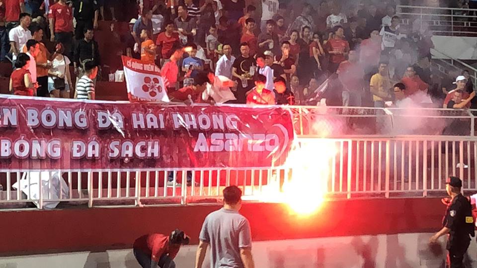 Giữa hiệp 1, những quả pháo sáng được đốt lên ở khán đài C trong sự hò reo một cách vô ý thức của nhiều CĐV Hải Phòng. Đối nghịch với hành ảnh xấu xí ấy là cảnh lực lượng an ninh và bảo vệ sân phải lo dập lửa một cách hết sức vất vả.