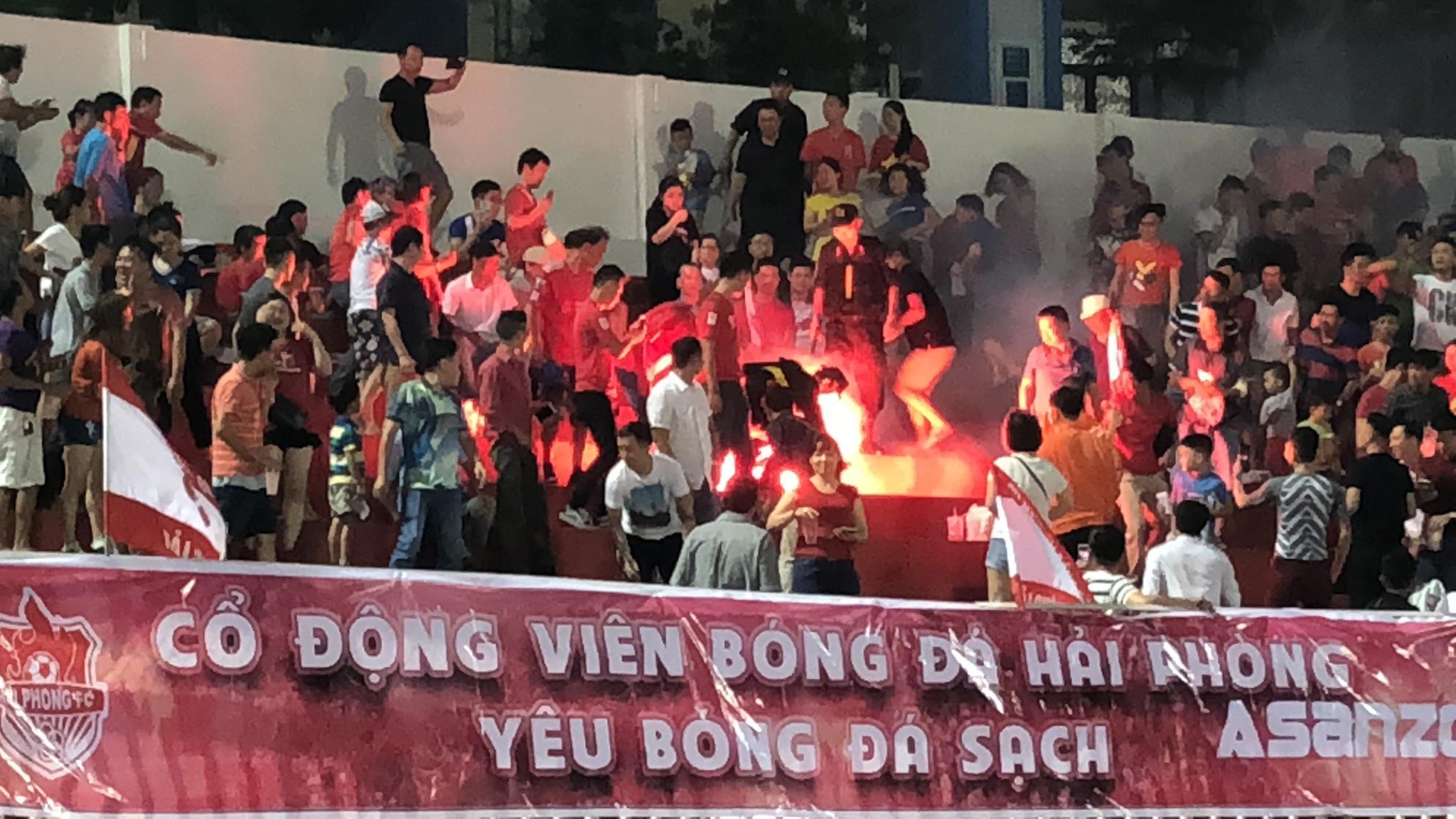 Hình ảnh đối nghịch từ thông điệp của tấm băng rôn và cảnh CĐV Hải Phòng đốt pháo sáng.