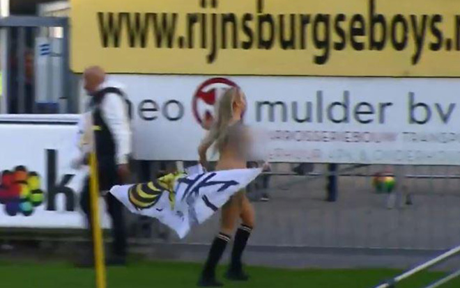 Khi trận đấu giữa Rijnsburgse Boys và AFC đang diễn ra, người đẹp nói trên trong tình trạng không mảnh vải che thân, tay cầm 1 lá cờ của CLB lao xuống sân. Mỹ nữ này thậm chí còn chạy đến khiêu khích các cầu thủ khiến trận đấu phải tạm dừng trong giây lát.