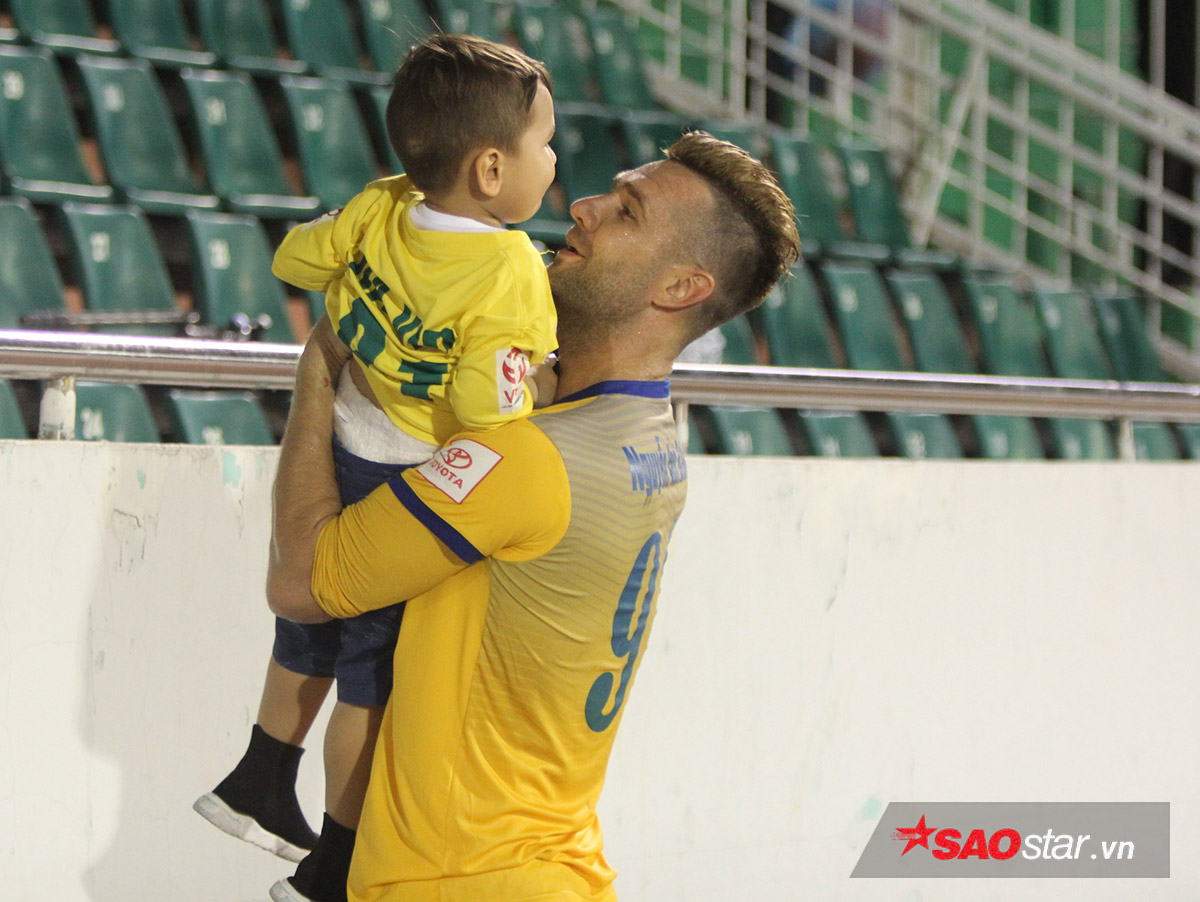 Trung vệ điển trai Nguyễn Van Bakel chơi đùa với cậu con trai giải buồn sau thất bại.