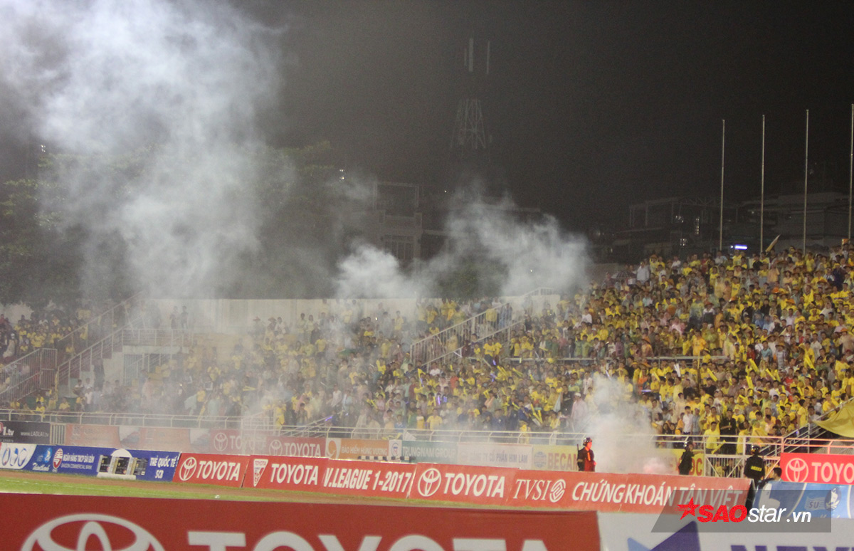 Pháo sáng làm khói bay nghi ngút khắp sân.