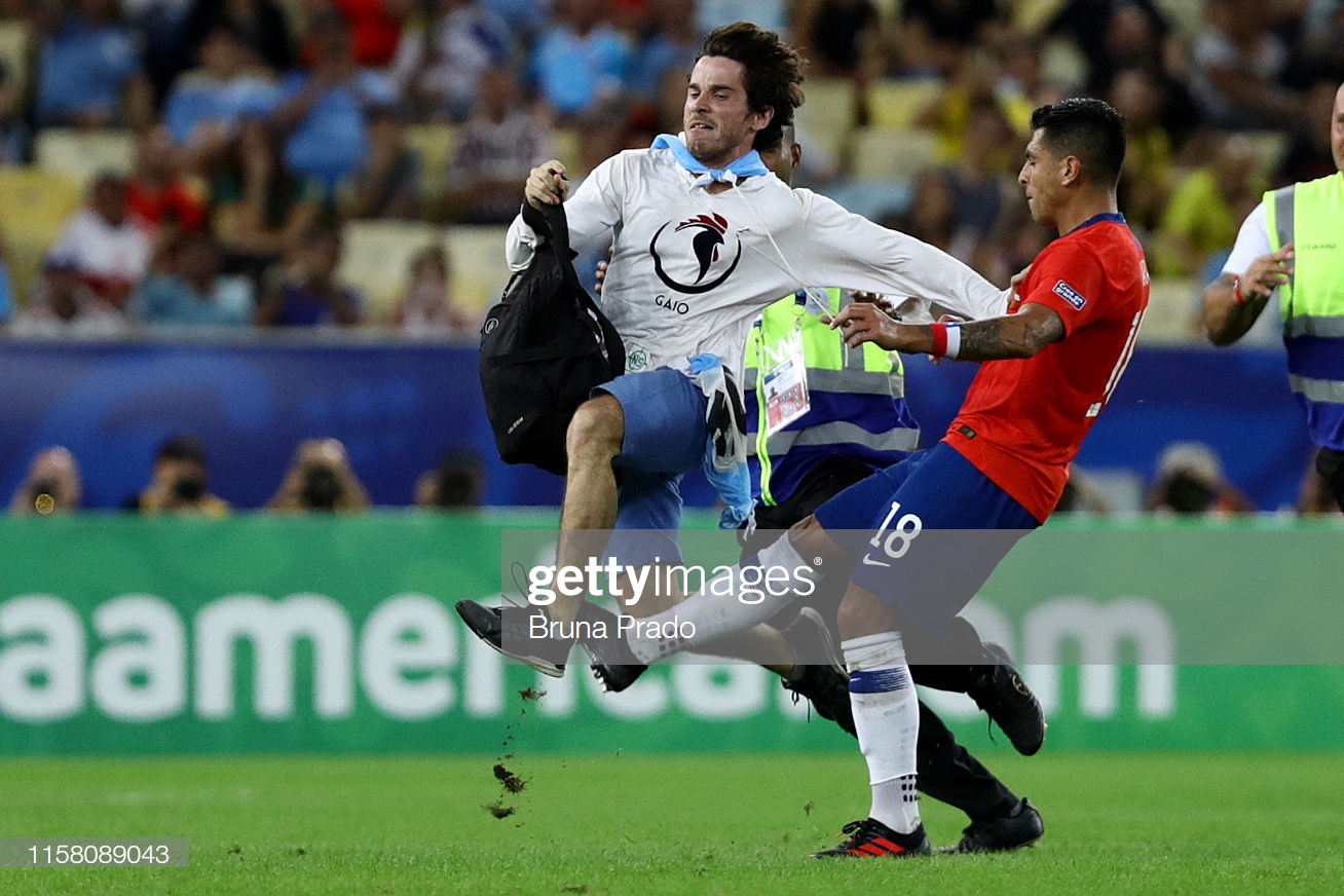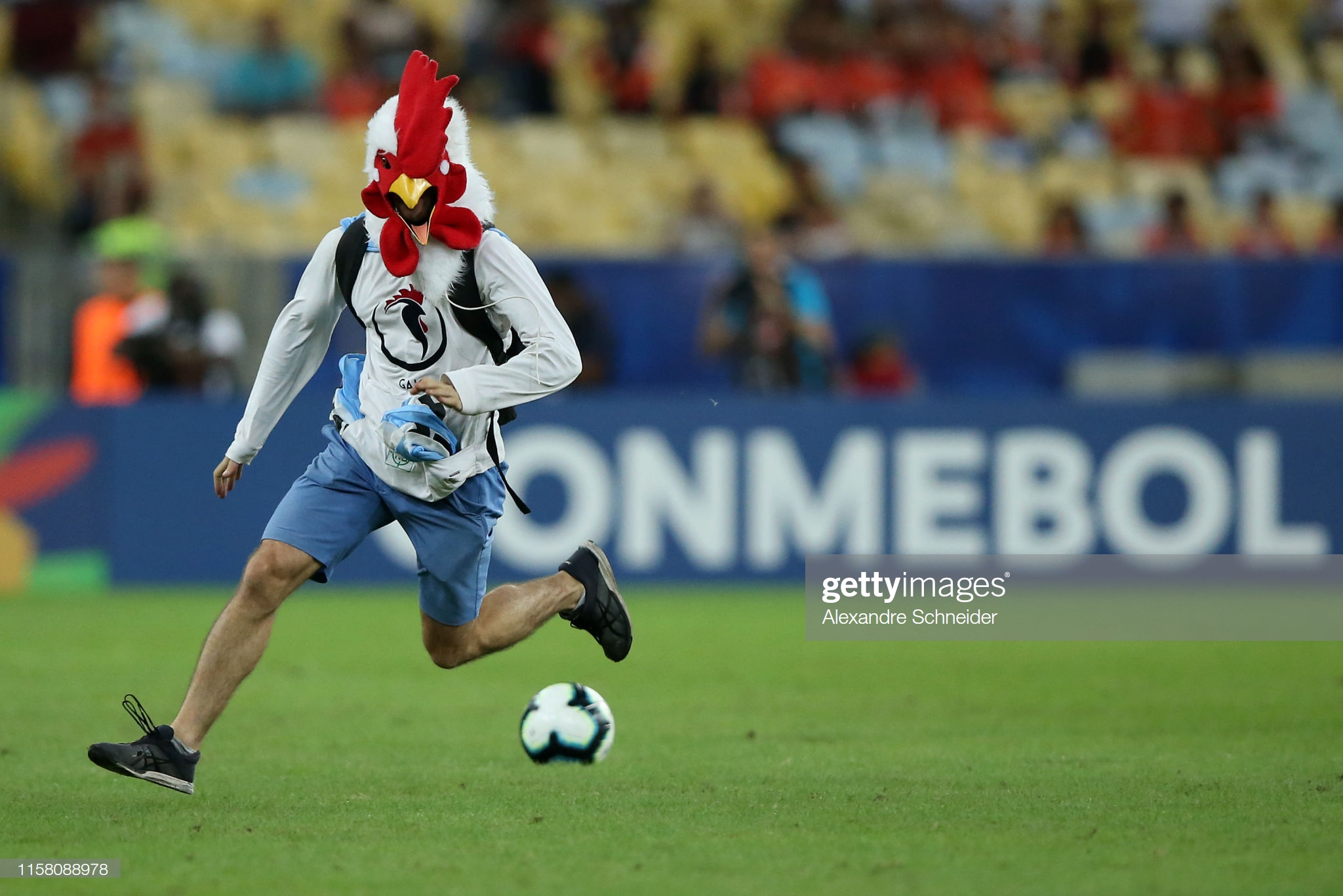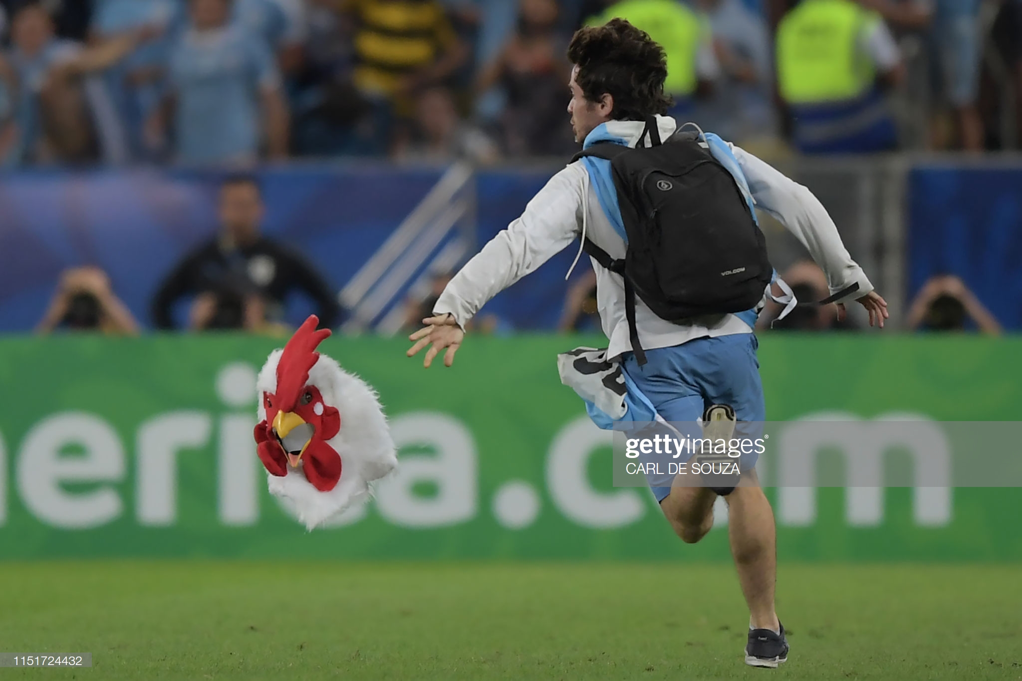 Tuy vậy thì cũng phải mất gần 3 phút thì lực lượng bảo vệ mới tóm gọn lại “người gà”. CĐV này chạy rất nhanh , pha rượt bắt tạo thành một cảnh tượng hiếm có ở một giải đấu lớn như Copa America.