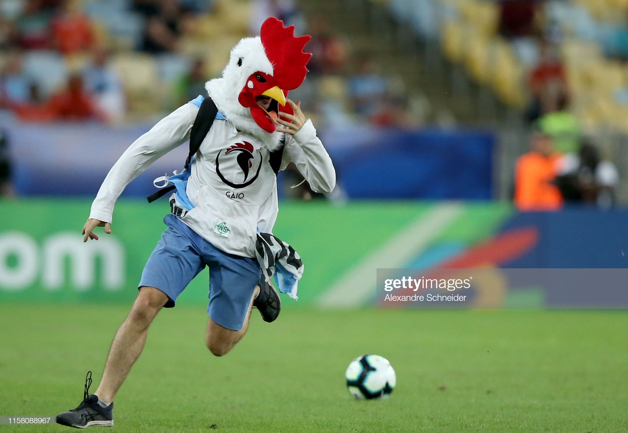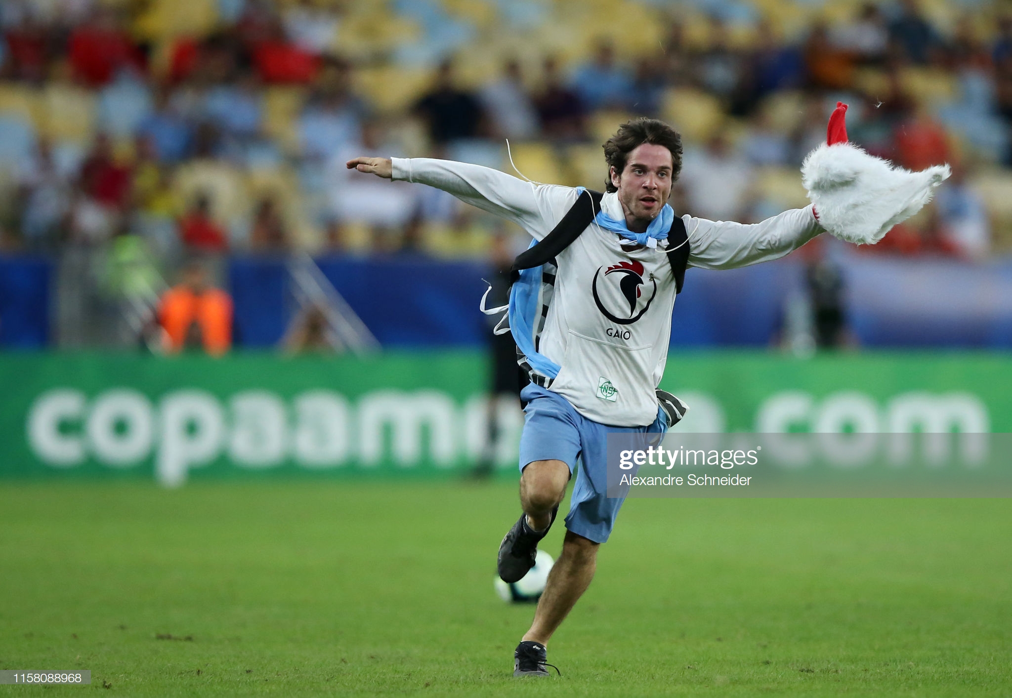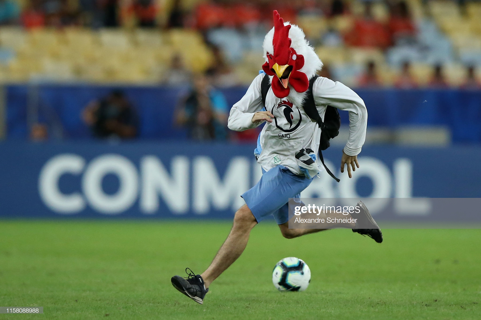 Tuy vậy thì cũng phải mất gần 3 phút thì lực lượng bảo vệ mới tóm gọn lại “người gà”. CĐV này chạy rất nhanh , pha rượt bắt tạo thành một cảnh tượng hiếm có ở một giải đấu lớn như Copa America.