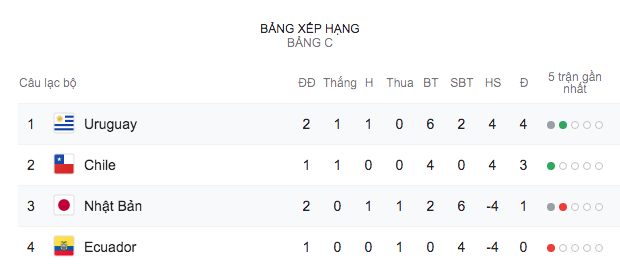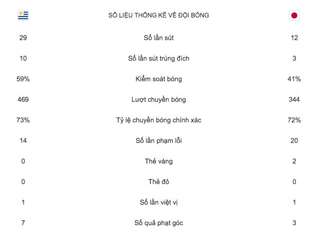 Chỉ có được 1 điểm, Uruguay chưa thể sớm giành vé vào vòng 1/8 bởi mới có 4 điểm/2 lượt trận. Trong khi đó, Nhật Bản đã có được điểm đầu tiên và thắp lại hy vọng đi tiếp bởi ai cũng biết kể cả đứng thứ 3 bảng đấu thì vẫn có thể mơ về một suất dự vòng 1/8.