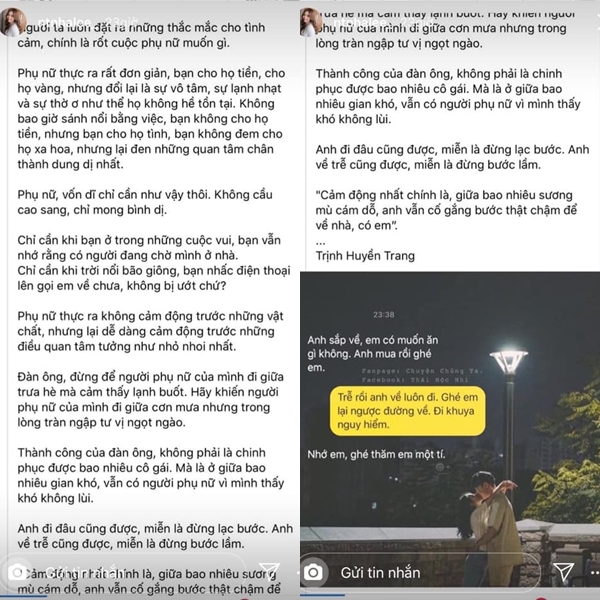 Nhật Lê cũng thường xuyên mượn những bài viết để gửi gắm những điều muốn nói với người yêu: “Cảm động nhất chính là , giữa bao nhiêu sương mù cám dỗ, anh vẫn cố gắng bước thật chậm về nhà , có em”. Không chỉ với vẻ ngoài xinh đẹp, mà còn có lòng vị tha, có lẽ đó là điều mà chàng cầu thủ đã có hành động chấm dứt phũ phàng với Huyền My để chứng minh một lòng một dạ về với Nhật Lê.
