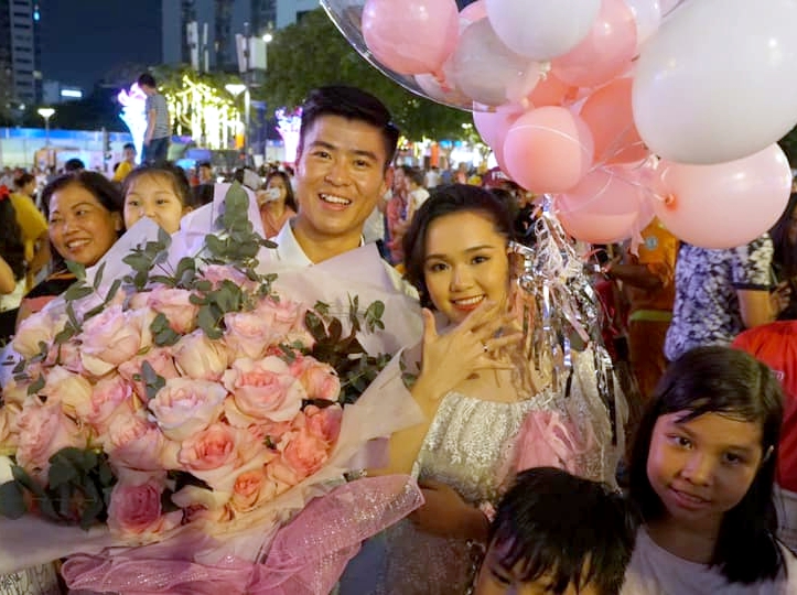 Duy Mạnh và Quỳnh Anh đã khép lại 3 năm yêu nhau bằng một màn cầu hôn siêu lãng mạn. (Ảnh FBNV)