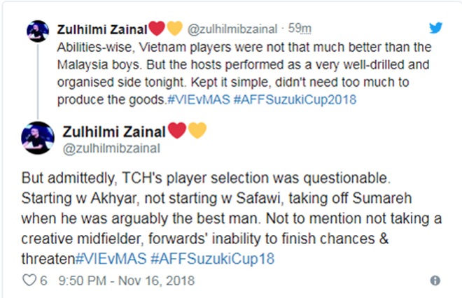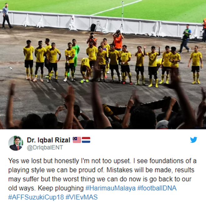 Trên trang mạng xã hội Twitter, nhiều CĐV Malaysia đã lên tiếng khen ngợi Việt Nam. Một tài khoản có tên Zulhilmi Zainal cho biết: “Về tài năng, các cầu thủ Việt Nam không vượt trội Malaysia nhưng đội chủ nhà lại chơi kỹ thuật và được tổ chức bài bản hơn. Đơn giản vậy thôi, không cần quá nhiều để có chiến thắng”.