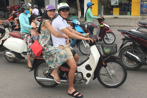 Công Vinh trong một lần đèo vợ bằng xe máy đi làm từ thiện.