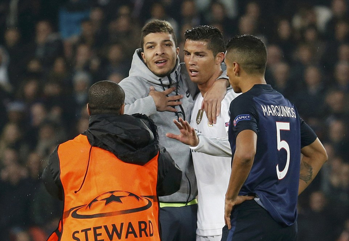 Tình huống diễn ra trong trận PSG - Real ở lượt thứ ba vòng bảng Champions League tối 21/10. Một CĐV cuồng chạy vào sân chỉ với một mục đích tiếp cận thần tượng Ronaldo và được đáp lại nhiệt tình. Ronaldo không chỉ trao cho CĐV cuồng một cái ôm mà còn ngăn nhân viên an ninh có hành động cưỡng chế bạo lực.