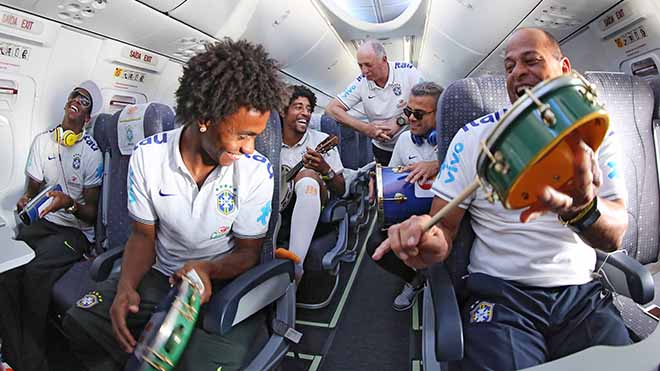 Willian chơi trống pandeiro trên một chuyến bay của ĐT Brazil