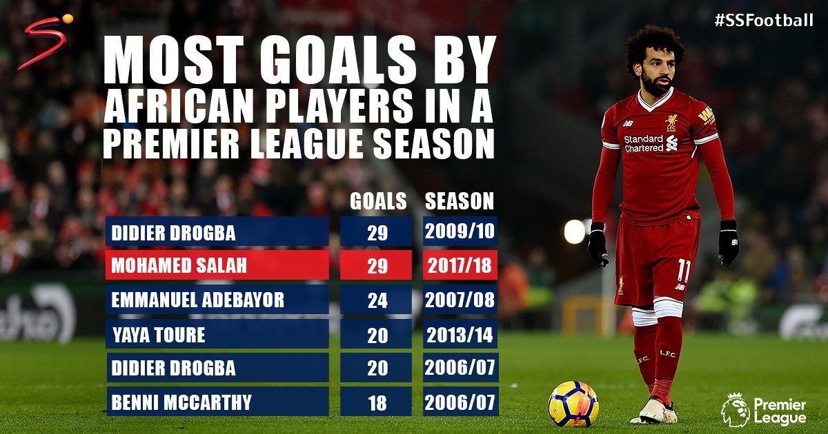 Ngoài ra, Salah còn chính thức sánh ngang với huyền thoại Chelsea Didier Drogba với tư cách là chân sút Châu Phi ghi nhiều bàn thắng nhất trong một mùa ở Ngoại hạng Anh với 29 bàn. Nên nhớ mùa bóng hiện tại còn chưa kết thúc và Salah sẽ vượt mặt 'Voi Rừng' trong một hay hai vòng đấu nữa mà thôi.