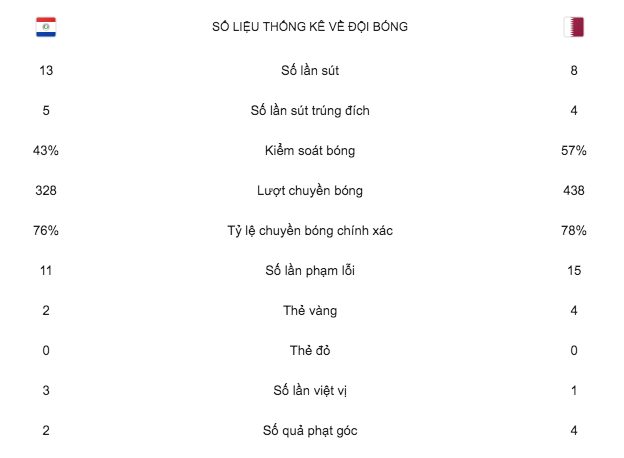 Những phút còn lại, những cơ hội tiếp tục xuất hiện với cả 2 đội nhưng không có thêm bàn thắng. Paraguay và Qatar đành chia điểm trong ngày ra quân.