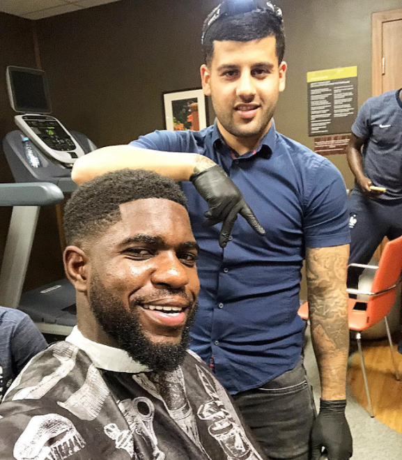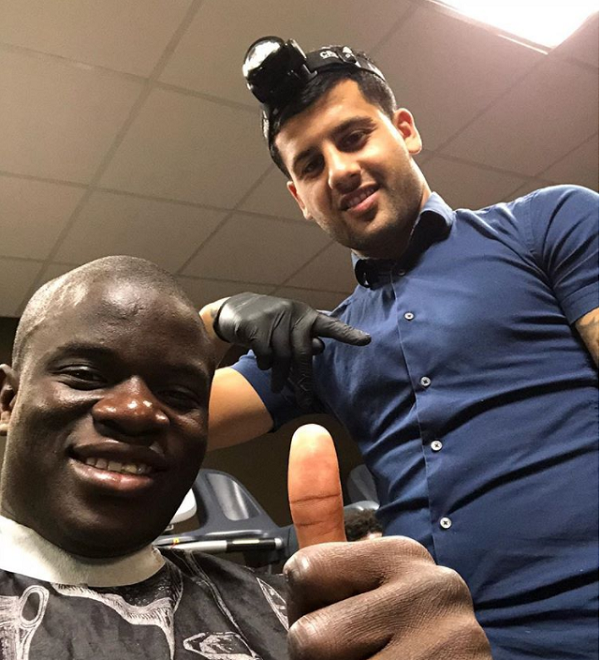 Kante thích thú chụp ảnh cùng thợ cắt tóc cho mình. Ảnh: The Sun.