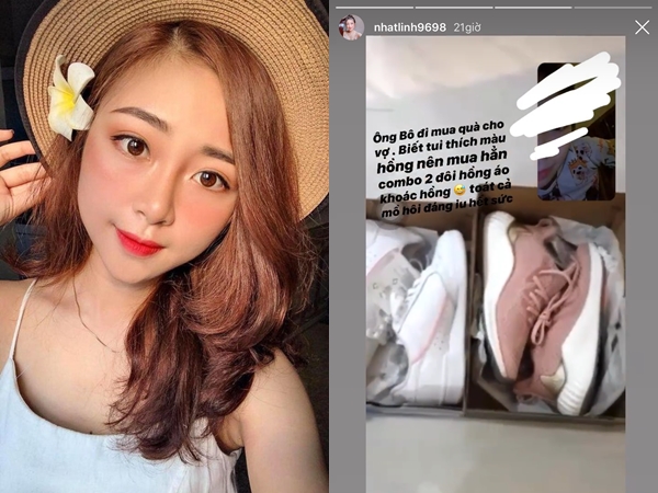 Trên tin instagram, cô nàng đã đăng đoạn clip quay lại cuộc gọi video với chồng, Phan Văn Đức khoe với vợ về hai đôi giày mà mình mới đi mua. Nhật Linh khen chồng hết sức đáng yêu: “Ông bô đi mua quà cho vợ. Biết tui thích màu hồng nên mua hẳn combo hai đôi hồng, áo khoác hồng. Toát cả mồ hôi, đáng yêu hết sức”.