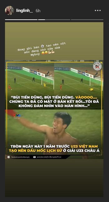 Thế nhưng, 2 tiếng trước giờ bóng lăn, Nguyễn Khánh Linh - bạn gái xinh đẹp của Bùi Tiến Dũng đã dự đoán như thần về kết quả và diễn biến của trận đấu hôm này với dòng story: “Hôm nay ghi bàn, tạo nên cột mốc đáng nhớ nữa nhé. My boy.” cùng hình ảnh ngày này năm trước bạn trai ăn mừng bàn thắng.