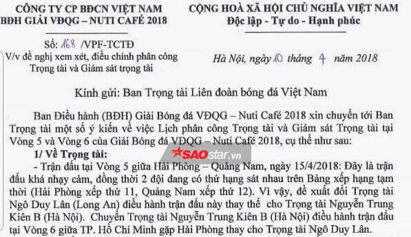 Về văn bản của VPF gửi Ban trọng tài có đoạn: “Đây là trận đấu khá nhạy cảm, đồng thời hai đội đang có thứ hạng sát nhau trên bảng xếp hạng tạm thời (Hải Phòng xếp thứ 11, Quảng Nam xếp thứ 12). Vì vậy, đề xuất đổi trọng tài Ngô Duy Lân (Long An) điều hành trận đấu này thay thế trọng tài Nguyễn Trung Kiên B (Hà Nội). Chuyển trọng tài Nguyễn Trung Kiên B (Hà Nội) điều hành trận đấu tại vòng 6 giữa TP.HCM gặp Hải Phòng thay cho trọng tài Ngô Duy Lân”.