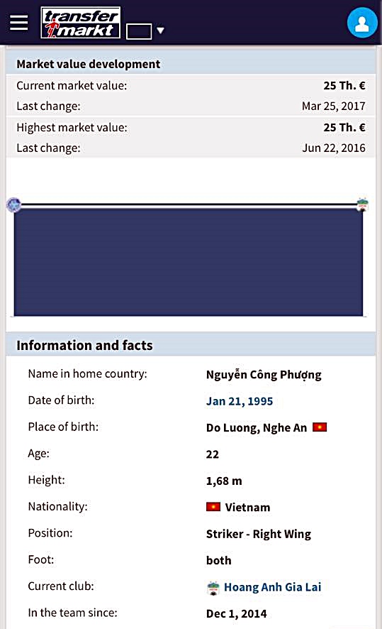 Theo đó, Transfermarkt định giá lần thứ 2 cho Công Phượng vào tháng 3/2017 là 25 nghìn euro, tức chỉ hơn 675 triệu đồng. Hồi tháng 6/2016, Transfermarkt cũng định giá Công Phượng 25 nghìn euro. Điều ấy cũng đồng nghĩa Công Phượng được định giá thực kém hơn cả trăm lần so với đồn thổi.