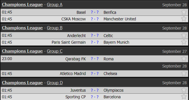 Lịch thi đấu UEFA Champions League các trận diễn ra tối 27/9 và rạng sáng 28/9.