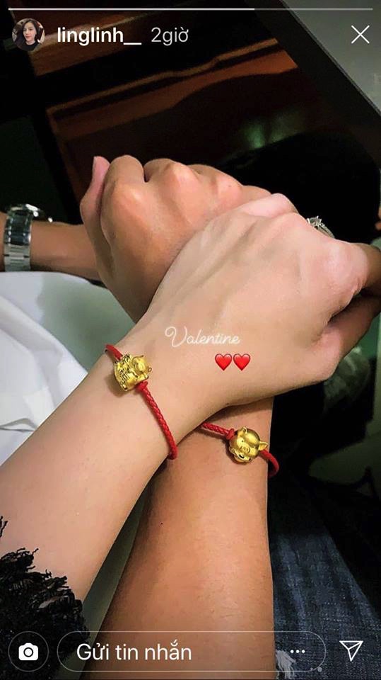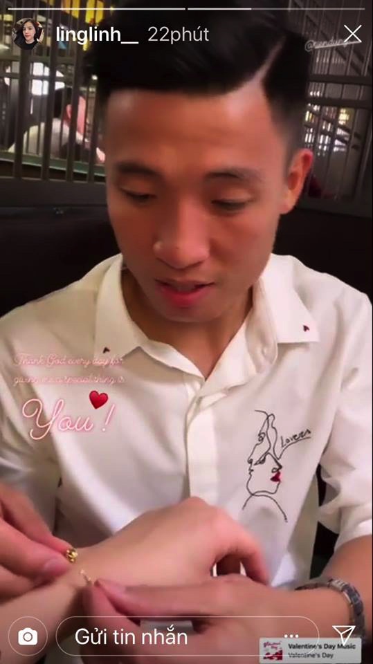 Trung vệ Bùi Tiến Dũng tặng cô bạn gái Khánh Linh chiếc vòng đeo tay có hình một chú lợn vàng để mang lại sự may mắn năm Kỷ Hợi.