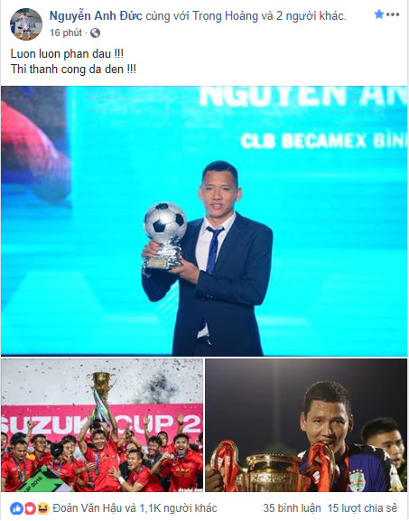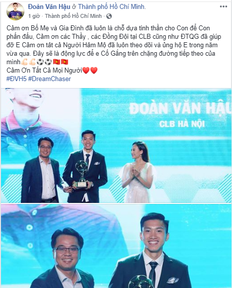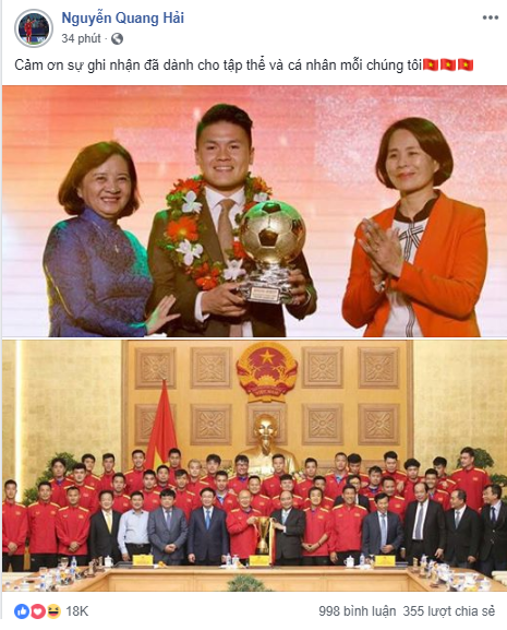 Trên trang cá nhân, Quang Hải chia sẽ với status ngắn gọn: “Cảm ơn sự ghi nhận đã dành cho tâp thể và cá nhân mỗi chúng tôi”.