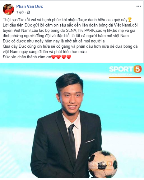 “Thật sự đức rất vui và hạnh phúc khi nhận được danh hiệu cao quý này. Lời đầu tiên Đức gửi lời cảm ơn sâu sắc đến Liên đoàn bóng đá Việt Nam, đội tuyển Việt Nam, câu lạc bộ bóng đá SLNA, HLV PARK, các vị HLV, bố mẹ và gia đình,những người đồng đội và đặc biệt là tất cả người hâm mô Việt Nam. Đức có được như ngày hôm nay là nhờ tất cả mọi người ạ. Qua đây Đức cũng xin hứa sẽ cố gắng và phấn đấu hơn nữa để đưa bóng đá Việt Nam ngày càng đi lên và phát triển hơn nữa. Đức xin chân thành cảm ơn”. Văn Đức phấn khích chia sẻ