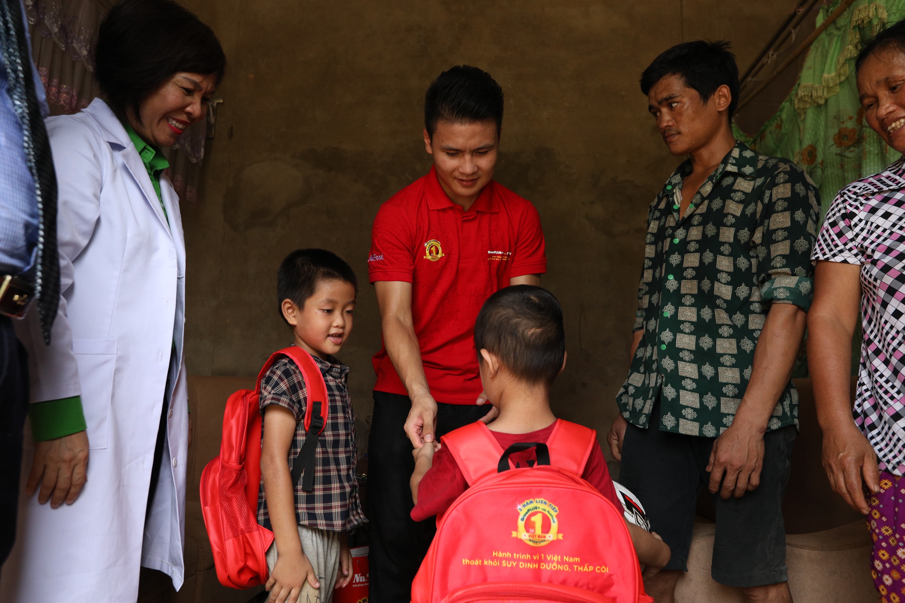 Quang Hải đã cùng đoàn bác sĩ của NutiFood và Hội Y tế công cộng TP.HCM đến thăm gia đình bé Trần Phi Hùng (4 tuổi), ở khu 3 xã Mỹ Luông.