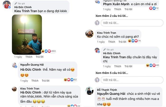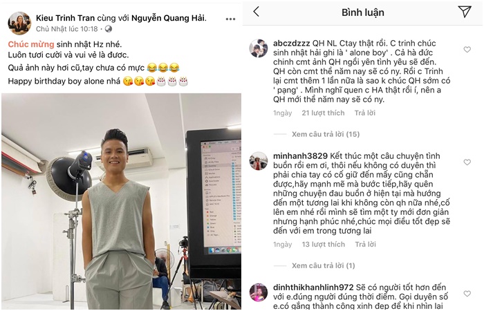Để tự trả lời cho những thắc mặc, có bạn còn tìm ra những bằng chứng chắc chắn rằng cả hai đã đường ai nấy đi, một fan đã bình luận: “Quang Hải và Nhật Lê chia tay thật rồi. Chị Trinh chúc sinh nhật Hải ghi là “Alone boy”. Cả Hà Đức Chinh cmt ảnh Quang Hải ngồi yên tình yêu sẽ đến. Quang Hải còn cmt thề năm nay sẽ có người yêu. Rồi chị Trinh lại cmt thêm một lần nữa là sao không chúc Quang Hải sớm có “pạng”. Mình nghĩ quen chị HA thật rồi í, nên anh Quang Hải mới thề năm nay sẽ có người yêu“.