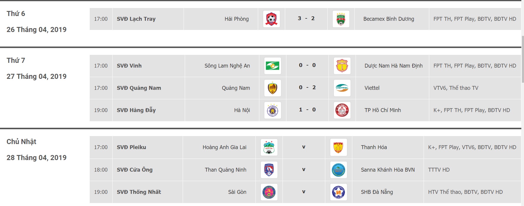Lịch thi đấu và kết quả vòng 7 V.League 2019