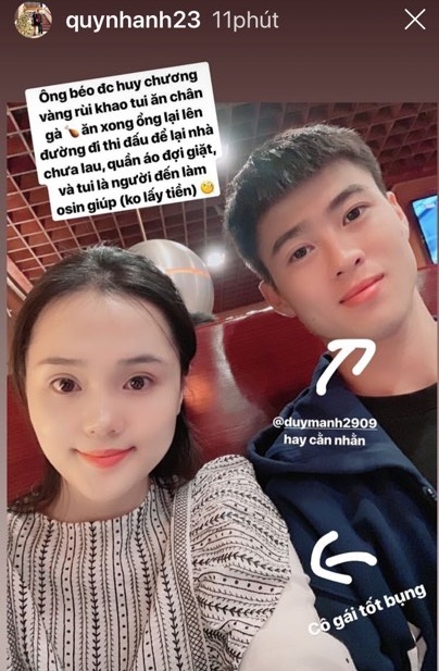 Sau khi đi ăn chân gà cùng bạn trai để mừng chức vô địch Siêu cúp Quốc gia, Quỳnh Anh hóm hỉnh chia sẻ: “Ông béo được huy chương vàng rồi khao tui ăn chân gà. Ăn xong ổng lại lên đường đi thi đấu, để lại nhà chưa lau, quần áo đợi giặt. Và tui là người đến làm osin giúp (không lấy tiền)”.
