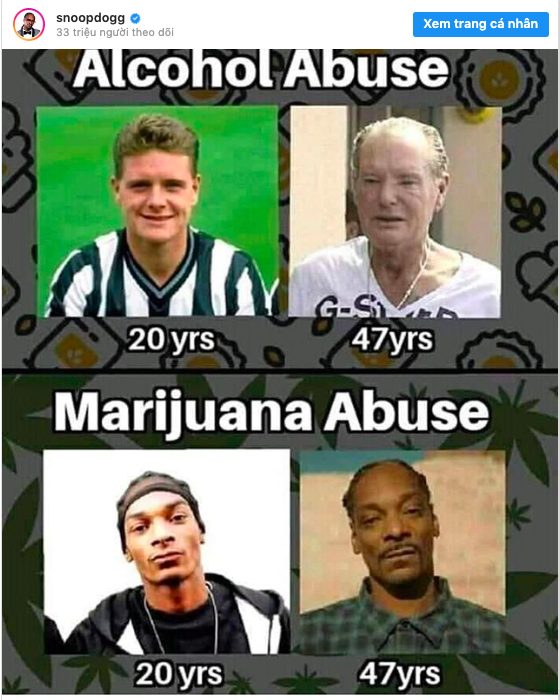 Cụ thể, Rapper đã đăng tải lên trang cá nhân hình ảnh so sánh giữa tác hại của rượu bia và lợi ích của việc sử dụng ma tuý. Snoop Dogg lấy gương mặt của Paul Gascoigne năm 20 tuổi và năm 47 tuổi để làm ví dụ cho tác hại của “nghiện rượu”. Về phần mình, anh tự hào cho rằng mình không hề già đi khi sử dụng cần sa.