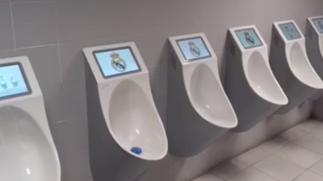 Trong một động thái đầy bất ngờ, ban lãnh đạo CLB Real Madrid vừa đặt những chiếc màn hình TV lên bồn tiểu nhà vệ sinh nam tại trong khu vực sân vận động Santiago Bernabeu. Chưa rõ lý do vì sao Los Blancos lại sử dụng hệ thống màn hình trên bồn tiểu.