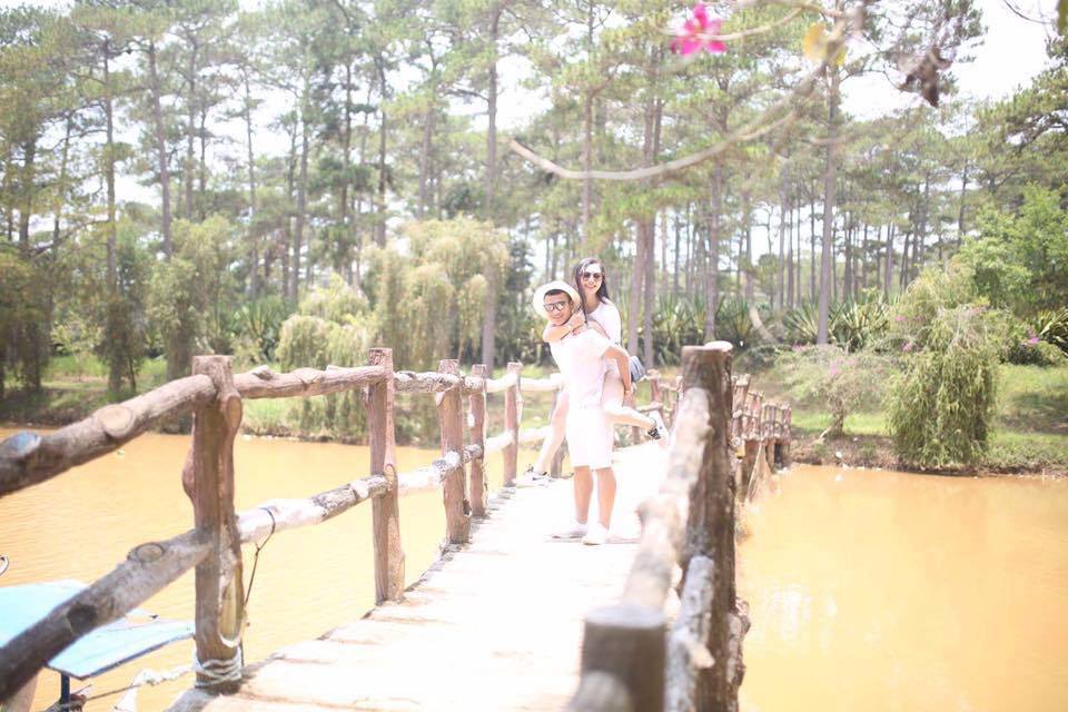 Trong khi đó gần như cùng thời điểm Phi Sơn đăng trạng thái đang hẹn hò, Ái Vi cũng đăng tải bức ảnh được người yêu cõng đi qua một chiếc cầu vô cùng lãng mạn và thơ mộng.