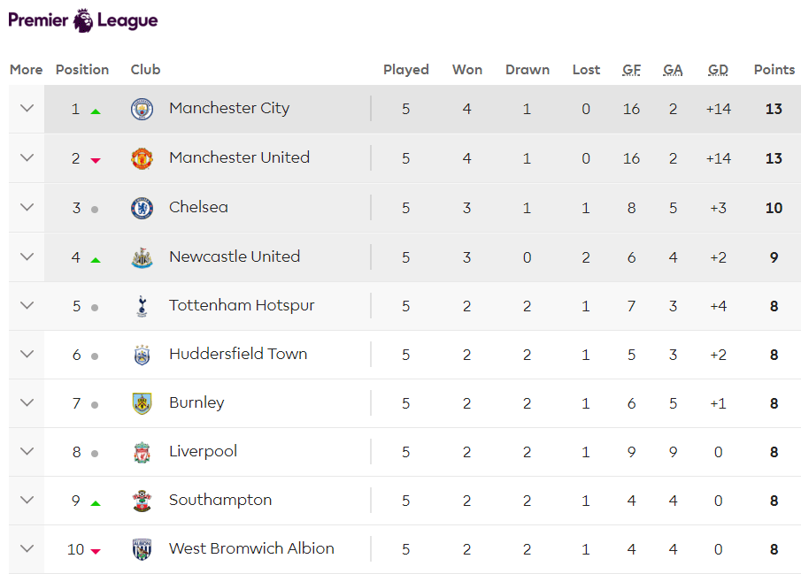Bảng xếp hạng top 10 Giải Ngoại hạng Anh sau vòng 5: