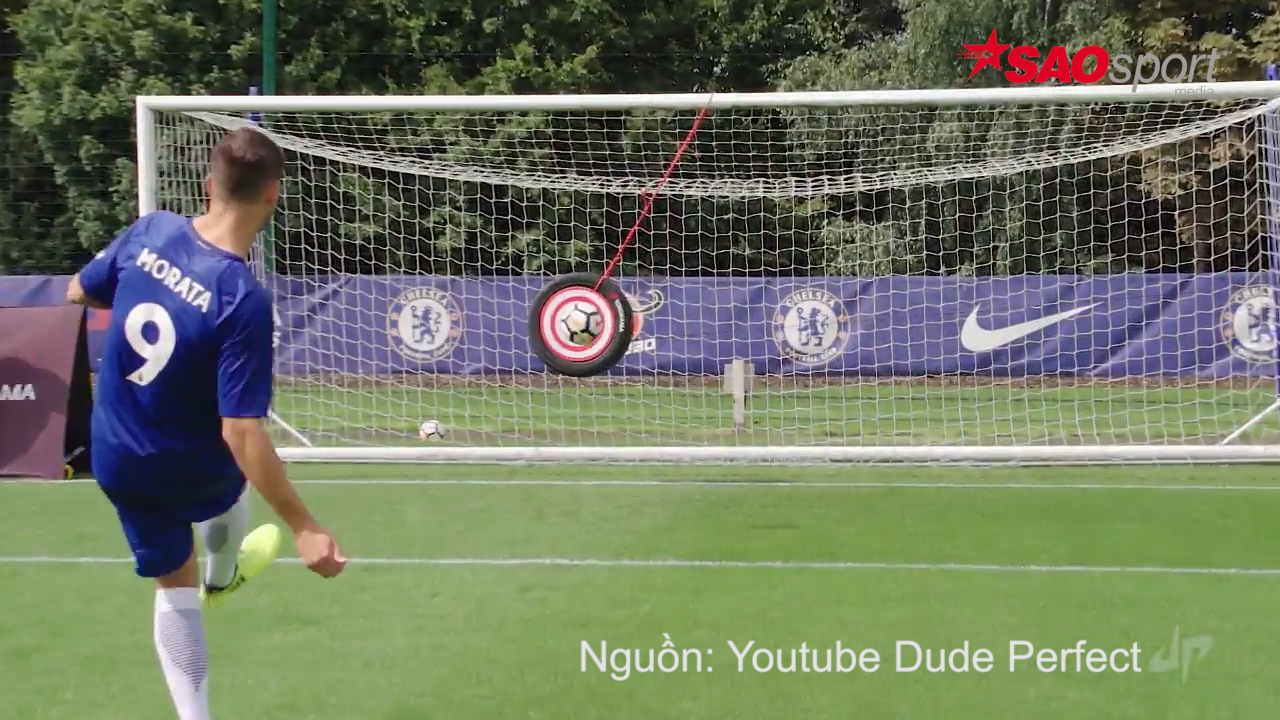 Morata thực hiện cú đá mục tiêu đang bị treo đung đưa.
