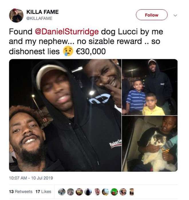 Người tìm ra chú chó là một ca sĩ có tên “Killa Fame”. Tuy vậy, sự việc lại tiếp tục “gây bão” trên MXH với một lý do khác. Anh cho rằng Sturridge thất hứa: “Đừng đưa ra phần thưởng nếu bạn không thể trả nó“. Theo tờ The Sun, số tiền mà Sturridge trả cho Killa Fame chỉ là… 320 Bảng.