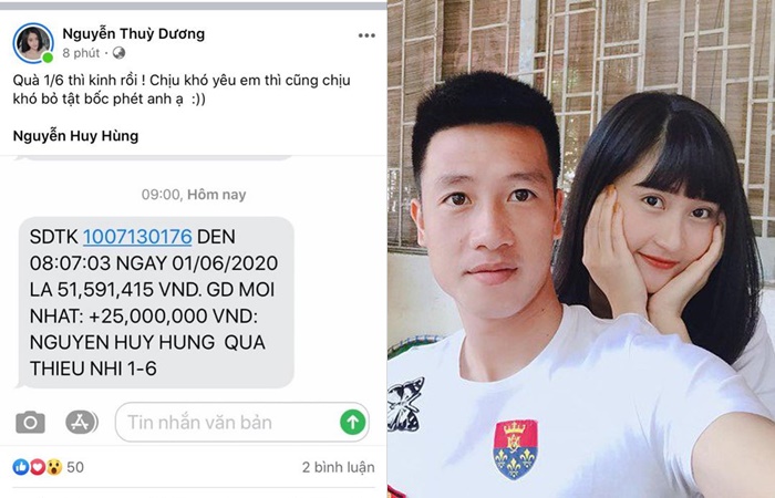 Sáng ngày 1/6, bạn gái Huy Hùng khoe trên trang các nhân hình ảnh chụp lại thông báo nhận được 25 triệu từ chàng cầu thủ tặng quà ngày lễ. Hot girl Hải Phòng khiến NHM “trầm trồ” về độ chịu chi của cầu thủ CLB Quảng Nam.