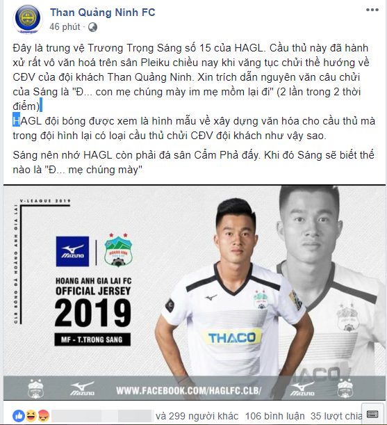 Sau trận thua CLB HAGL 2-3 ở phố Núi, page Than Quảng Ninh FC đã bất ngờ đăng tải một thông điệp “tố” cầu thủ Trương Trọng Sáng của HAGL có hành vi không chuẩn mực với CĐV Quảng Ninh.