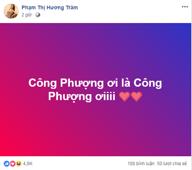 Hương Tràm “phát cuồng” Công Phượng sau bàn mở tỉ số trận đấu ở phút thứ 11. Nữ ca sĩ của nhiều bản hit bày tỏ sự hâm mộ với dòng trạng thái: “Công Phượng ơi là Công Phượng“. Cộng đồng mạng nhân dịp đó nhanh chóng “đẩy thuyền” cho cả hai về một nhà. Nếu chuyện này có thể xảy ra thì đây sẽ là “cặp đôi mưa” hot nhất của showbiz Việt.