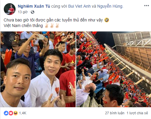 Nghiêm Xuân Tú có lẽ là trường hợp vắng mặt đáng tiếc nhất của ĐTVN ở AFF Cup năm nay dù có màn trình diễn không kém phần xuất sắc ở V.league 2018. Thế nhưng, cầu thủ này vẫn đến trực tiếp SVĐ Mỹ Đình để theo dõi và ủng hộ đội tuyển. Xuân Tú hòa cùng niềm niềm vui chiến thắng với dòng trạng thái: “Chưa bao giờ tôi được gần các tuyển thủ đến như vậy. Việt Nam chiến thắng”.