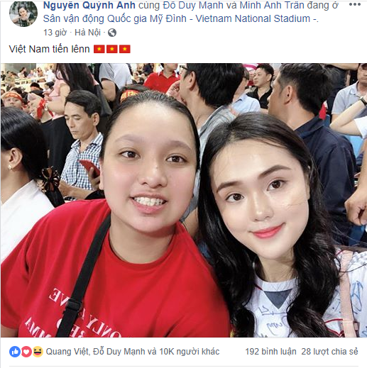 Ngoài ra còn có cô nàng xinh đẹp Nguyễn Quỳnh Anh - bạn gái hot boy Đỗ Duy Mạnh. Cô vô cùng rạng rỡ trên khán đài, không ít lần camera trận đấu đã bắt được những khoảnh khắc xinh đẹp của cô.