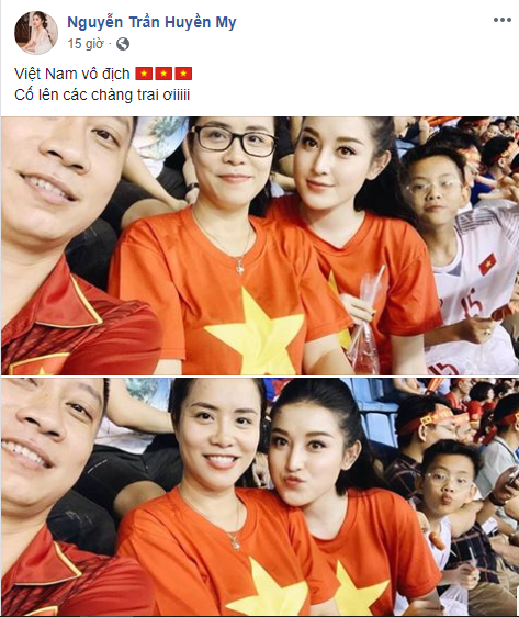 Á hậu Huyền Mi là fan cứng của bóng đá Việt Nam, mặc dù bận rất nhiều công việc nhưng cô cũng tranh thủ thời gian đến sân cổ vũ cho đội. Huyền Mi ghi lại khoảnh khắc nhí nhảnh mặc áo cờ đỏ sao vàng tươi vui chụp cùng gia đình.