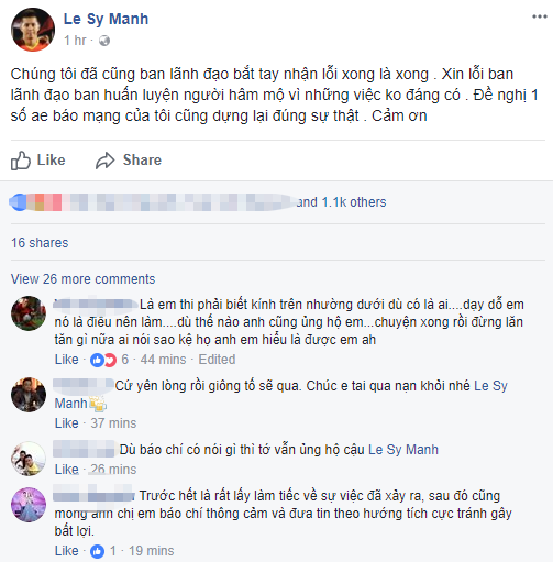 Dòng trạng thái xin lỗi của Sỹ Mạnh cũng đúng chất “đàn ông” của cựu tiền đạo Việt Nam. Sỹ Mạnh nổi tiếng ngông, nhiều khi để xảy ra những chuyện đáng tiếc nhưng luôn sẵn sàng chịu lỗi nếu sai lầm.