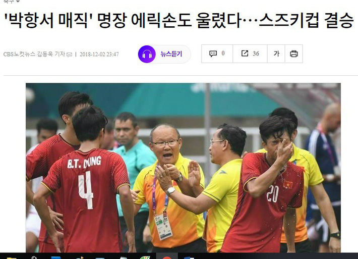 Website Nocutnews của Hàn Quốc lại bình luận: “Phép thuật” của HLV Park Hang Seo đã thổi bay kinh nghiệm nhà cầm quân người Thụy Điển Eriksson. Với chiến thắng 2-1 trên sân khách, Việt Nam đã nắm lợi thế quá lớn để tiến vào trận chung kết AFF Cup - đấu trường được ví như World Cup của khu vực Đông Nam Á.