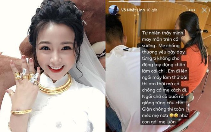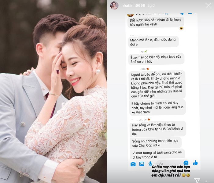 Cách đây không lâu, Nhật Linh chia sẻ lên story instagram hình ảnh chàng cầu thủ và mẹ ngồi đợi cô thi thử bằng lái xe ô tô: “Tự nhiên thấy mình may mắn trên cả sung sướng. Mẹ chồng thương yêu bày dạy từng tí không cho động tay động chân làm cái chi. Em đi lên ngồi máy làm thử bài thi ô tô thôi mà cả chồng cả mẹ xách đi. Ngồi chờ cả buổi rồi giảng từng câu cho. Giận chồng thì toàn méc mẹ nữa. Như con gái mẹ luôn”.