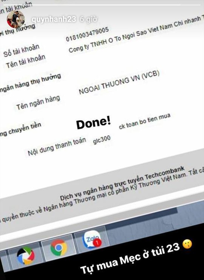 Mới đây, trên trang intagram cá nhân, Quỳnh Anh - bạn gái của trung vệ Đỗ Duy Mạnh đã đăng tải hình ảnh hoàn tất thanh toán giao dịch mua xe Mercedes GLC 300 kèm dòng trạng thái: “Tự mua Mec ở tuổi 23″.