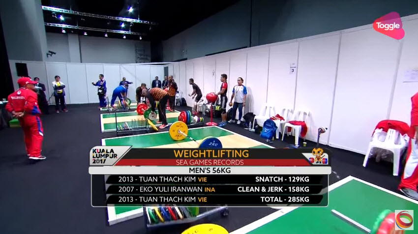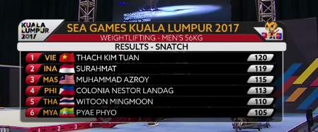 Với mức tổng cử là 269kg, trong đó cử giật là 120kg và cử đẩy 149kg vượt qua lực sỹ của Surahmat của Indonesia 2 kg.