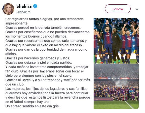 Sau đêm kinh hoàng ở Anfied, nữ hoàng nhạc Rock Shakira đã đăng tải một thông điệp ủng hộ và động viên đến các cầu thủ Barcelona cũng như người chồng của mình - Gerard Pique.