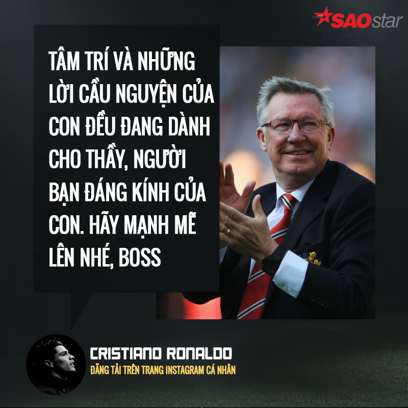Trong đó, phải kể đến là cậu học trò có thể nói là xuất sắc nhất trong sự nghiệp cầm quân của ông thầy người Scotland đó là ngôi sao Cristiano Ronaldo. Anh đã cho đăng tải lên trang Instagam của mình bức ảnh chụp cùng người thầy đang đối mặt với tử thần kèm lời chúc: “Tâm trí và những lời cầu nguyện của con đều đang dành cho thầy, người bạn đáng kính của con. Hãy mạnh mẽ lên nhé, boss”.