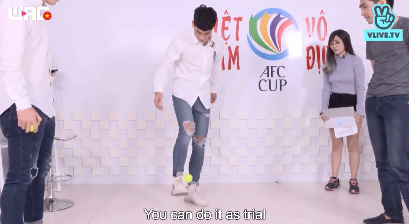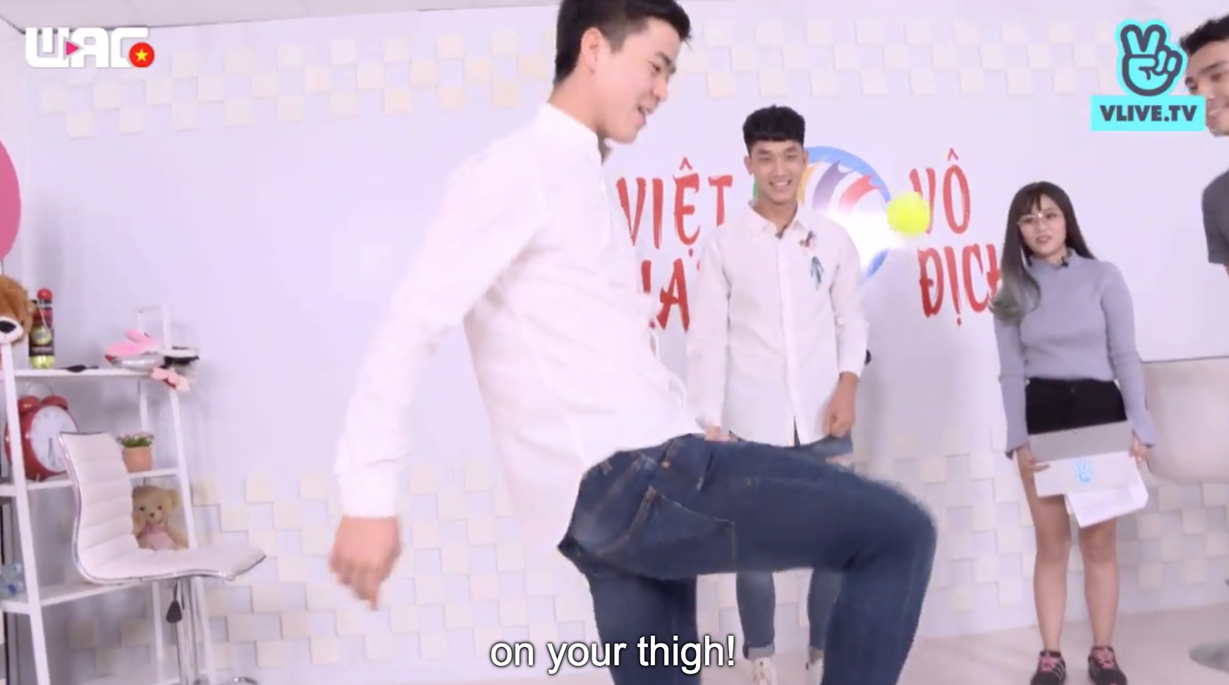 19h05: Cả hai cũng bắt đầu chuyển sang thực hiện thử thách đầu tiên của V LIVE. Cả hai sẽ phải tâng bóng tối thiểu 30 lần với 1 trái bóng tenis. Nếu không thực hiện được sẽ phải thực hiện biểu cảm dễ thương hoặc tỏ tình qua máy quay.