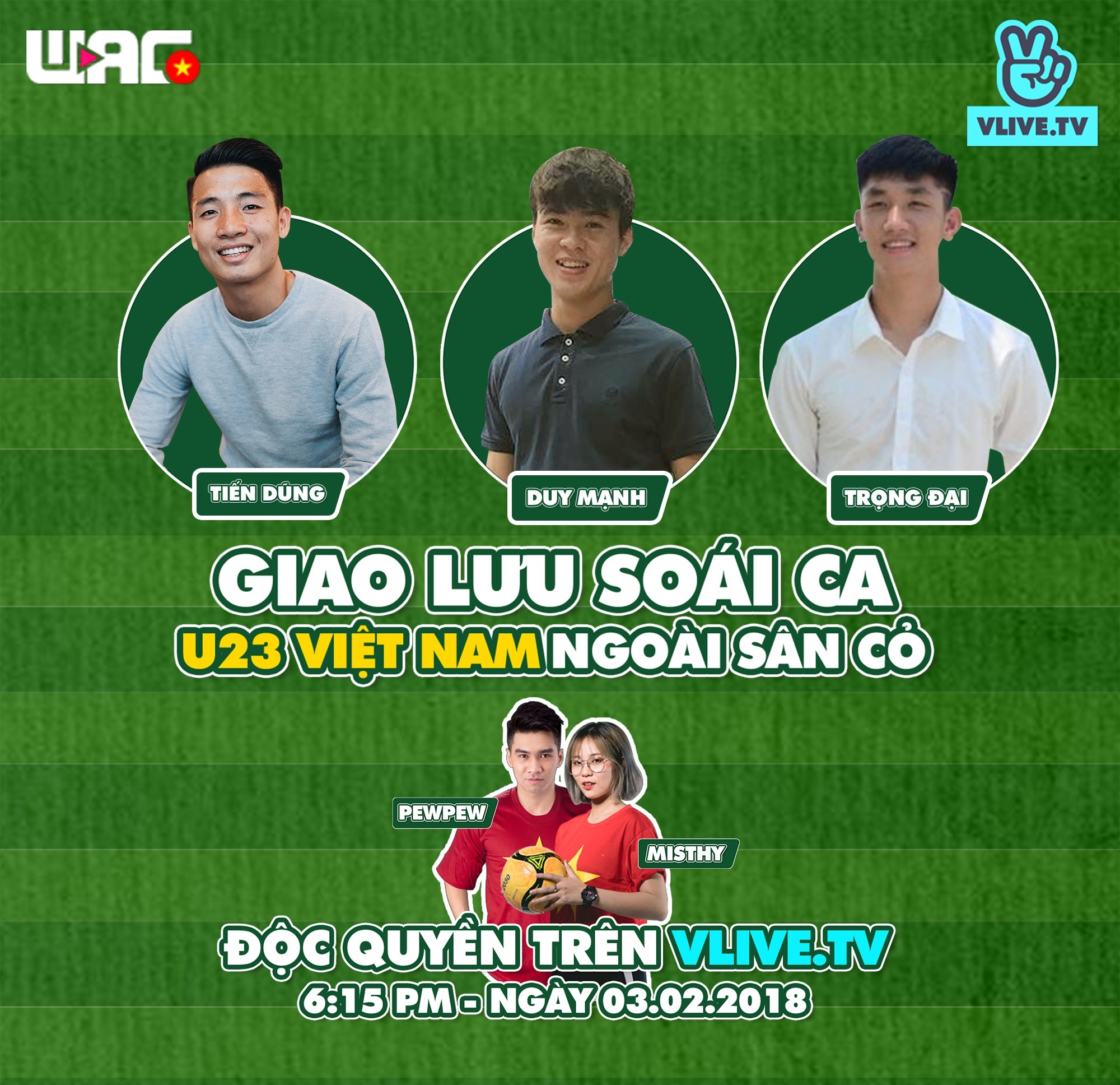 Bắt đầu từ 18h15 ngày hôm nay (3/2), các cầu thủ của đội tuyển U23 Việt Nam bao gồm trung vệ Duy Mạnh và Trọng Đại sẽ có buổi giao lưu trực tuyến với khán giả trên ứng dụng truyền hình trực tiếp V Live.